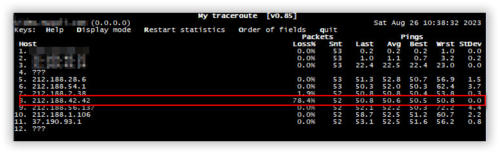 (29.08.23 11:31)  (29.08.23 09:43) Утренний Абб и Ист |-----------------------------------------------... | WinMTR statistics | | Host - % | Sent | Recv | Best | Avrg | Wrst | Last | |-----------------------------------------------...| a433-cr02-be5.77.msk.mts-internet.net - 1 | 854 | 849 | 17 | 85 | 1383 | 63 | | a197-cr06-be18.77.msk.mts-internet.net - 35 | 366 | 239 | 0 | 78 | 744 | 52 | | mag9-cr02-be14.77.msk.mts-internet.net - 1 | 862 | 859 | 27 | 97 | 1028 | 71 |