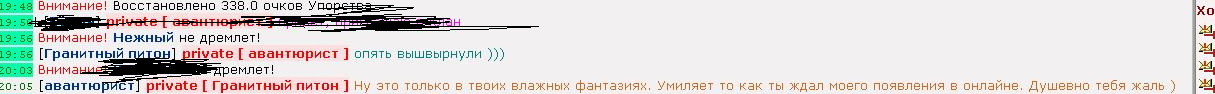 (12.09.24 22:43) Никаких дебатов или дискуссий с этим персонажем не веду(Гранитный питон). Но оно мне зачастило язвить в приват без какой либо причины. Это тело следит за моими последними клановыми боями, и когда мы сливаем, он язвит в приват. Выхожу из кланапо своей воле, он опять язвит в приват. Ну тупо следит за мной. Может это питоно-любовь? img.scrolls.combats.com ... wIXvCD3ylOT9tw7rEOQPIcbLvdiI4hBYyeOgKpZTw.jpg